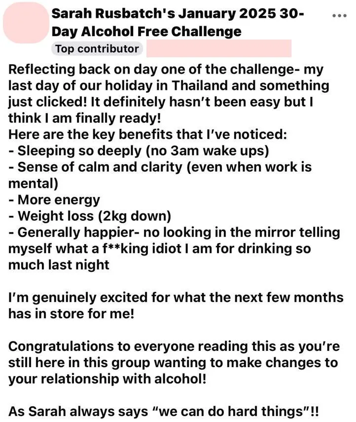 "This challenge has been life changing for me. Sarah's support throughout the challenge has been amazing. For someone who has been trying to moderate their alcohol for 4 years, I thought there was something wrong with me. That it was my fault.